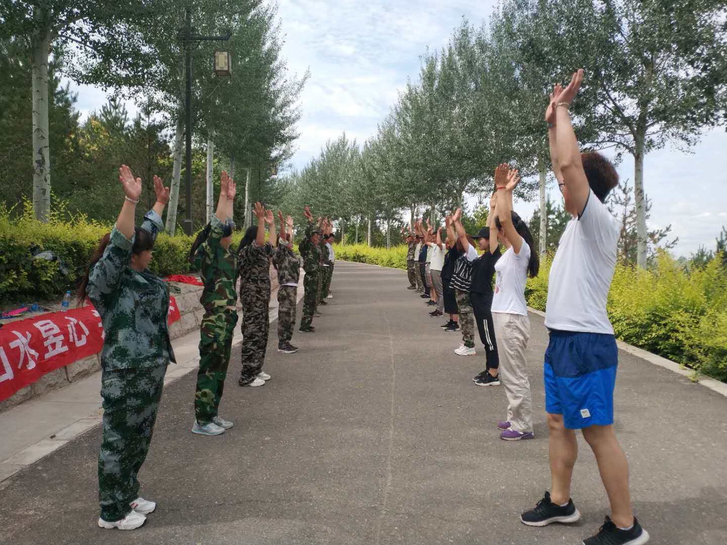 早上8點到黃河樓后,我們對18名新學員進行了分組,將隊員分成兩支隊伍,由隊長組織進行游戲。在隊長的帶領下,各隊隊員精誠合作,相互支持,先后進行了“跳繩比賽”、“個人跳繩比賽”、“斗牛比賽”“背對背運氣球比賽”“拔河比賽”、“俯臥撐比賽”等拓展項目。
