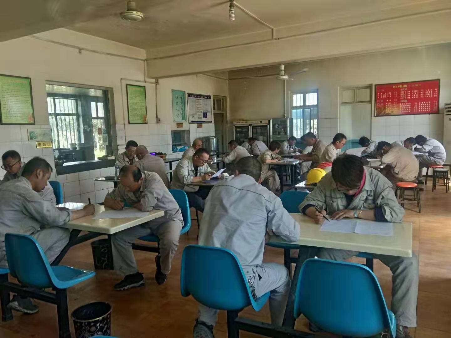 考試分為兩場進行,考場分別設在公司餐廳及會議室,此次考試以近期培訓的《危害生產安全刑事案件兩高司法解釋》、《危險性作業管理要求》、《電石、水泥系統較大風險作業安全管控措施》及管理人員應知應會知識為主,考試分為A、B卷組織進行,現場為避免抄襲現象,組織將手機集中保管,分離對坐。