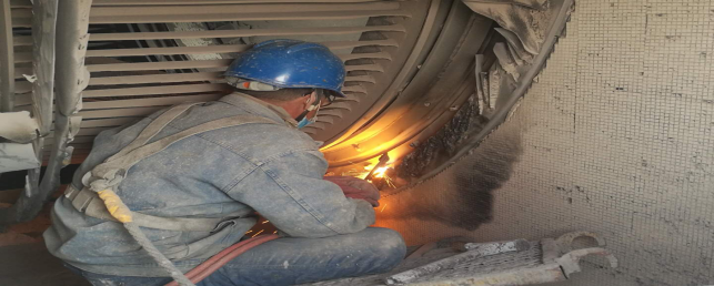 在回轉(zhuǎn)窯,做好更換窯磚前期準(zhǔn)備工作——清理深挖4米處窯皮、窯磚。