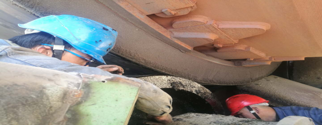 (3)回轉(zhuǎn)窯輪帶擋圈及墊板補(bǔ)焊加固,檢查大齒圈齒面磨損并對齒面打磨修復(fù)(完成);