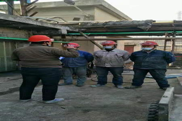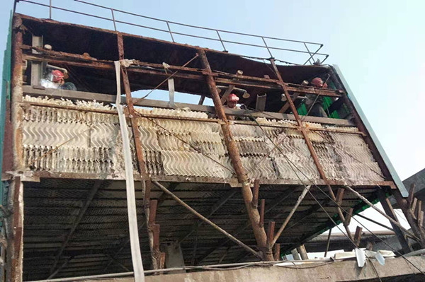 在完成相關作業(yè)的準備工作,穿戴好各類防護用品,簽發(fā)了各類票證后,大家就進入到檢修現(xiàn)場。加固冷卻塔前,必須先拆除冷卻塔壁板,清洗冷卻塔填料雜物及易燃易爆物質(zhì)。由于冷卻塔結(jié)構(gòu)腐蝕嚴重,填料內(nèi)部含易燃易爆物質(zhì)多,所以必須對冷卻塔進行多次沖洗徹底除去易燃易爆物質(zhì)才能進行動火加固作業(yè)。