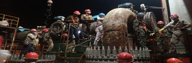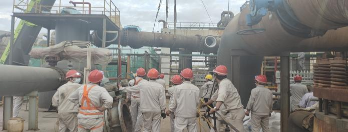 第一天氯乙烯裝置迅速拉開(kāi)檢修戰(zhàn),先是對(duì)水堿洗組合塔進(jìn)、出管口線漏點(diǎn)進(jìn)行消除,安排吊車及相關(guān)人員在場(chǎng),辦證,拆除管節(jié)前的準(zhǔn)備工作做好后立即組織人員開(kāi)始卸閥門,在檢修工和吊車的完美配合下,漏點(diǎn)的管節(jié)拆除完成,后安排生產(chǎn)科主管去平羅襯塑。另外一邊精餾場(chǎng)地也是熱鬧非凡,檢修工作雖然忙碌但不盲目,人員拆除,你卸閥門,他焊缺口,我高空作業(yè),吊車協(xié)助拆卸高低塔塔盤篩網(wǎng),安全著陸后立即組織人員進(jìn)行清洗,清洗完成后又組織安裝,一切如行云流水,維修工熟悉的手法給安全檢修及順利開(kāi)車又加了一道保險(xiǎn)。混合脫水管線技改是片區(qū)及集團(tuán)公司領(lǐng)導(dǎo)關(guān)注的重點(diǎn),此次檢修,管線碰口,也是尤為重要,在相關(guān)技術(shù)人員及維修工的協(xié)作下,做了氣相預(yù)留口,為后期混合脫水項(xiàng)目開(kāi)車平穩(wěn)運(yùn)行埋下了伏筆。