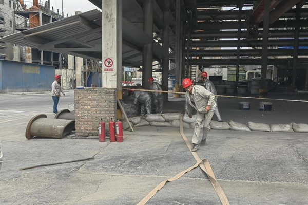 各應急救援小組到達現(xiàn)場,根據(jù)職責分工全力做好搶險準備工作。治安救護組按程序組織對現(xiàn)場設立警戒線,做好人員控制及疏散、道路疏通工作,生產(chǎn)保障組落實其他裝置生產(chǎn)及現(xiàn)場防汛情況,同時組織進行滅火;搶險搶修組現(xiàn)場進行圍堰堵水并疏通排水溝。搶險搶修結束后,對事故隱患再次進行排查、消除,并有序恢復現(xiàn)場生產(chǎn)作業(yè)。
