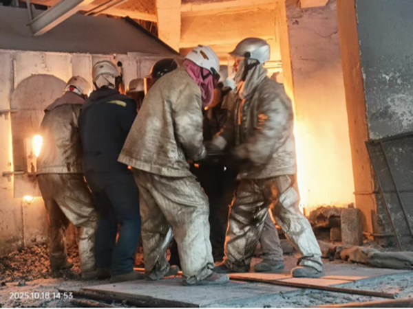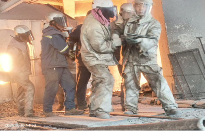 出爐工,是這里的主角。他們身著被汗水反復(fù)浸透又烤干、結(jié)出白色鹽漬的阻燃服,頭戴沉重的防護(hù)頭盔,像無(wú)畏的戰(zhàn)士,堅(jiān)守在陣地的最前沿。他們的工作,是時(shí)刻關(guān)注爐況,用長(zhǎng)長(zhǎng)的鋼釬疏通投料口,防止“棚料”。每一釬下去,都需要全身的力氣,與爐內(nèi)黏稠的料漿抗?fàn)帯:顾畯念~頭滾落,迷住雙眼,卻來(lái)不及擦拭,因?yàn)闋t火不等人。