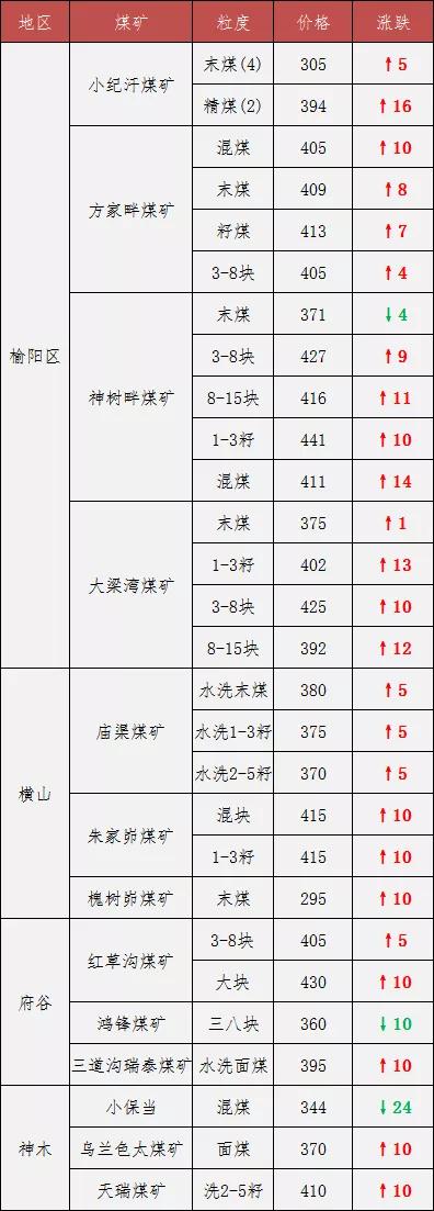 據(jù)榆林煤炭交易中心數(shù)據(jù)顯示,現(xiàn)在榆陽(yáng)區(qū)(6000K 0.6S)標(biāo)準(zhǔn)煤均價(jià)已漲至399元/噸,神木(5800K 0.4S)標(biāo)準(zhǔn)煤均價(jià)漲至385元/噸,府谷(5500K 0.4S)標(biāo)準(zhǔn)煤均價(jià)漲至355元/噸。