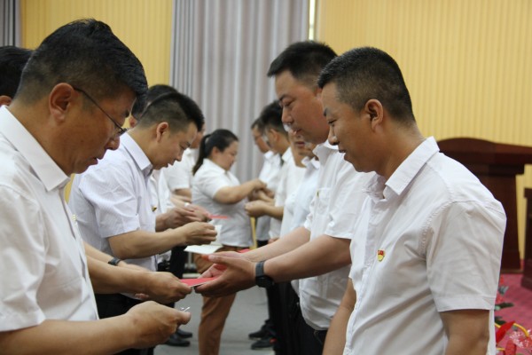 黨委領導班子為新黨員佩戴黨徽,頒發《黨章》。